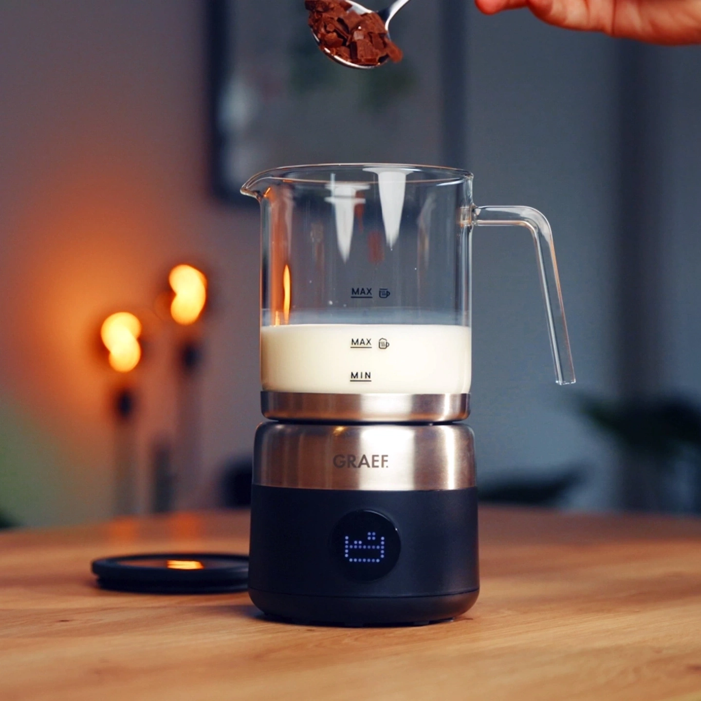 Mit dem Glas-Milchaufschäumer von GRAEF holst du dir Barista-Qualität direkt in deine Küche. Auf Knopfdruck verwandelst du Milch oder pflanzliche Alternativen wie Soja-, Hafer- oder Mandelmilch in feinsten, cremigen oder voluminösen Milchschaum. Auch kaltes Aufschäumen, warme Milch oder samtige heisse Schokolade gelingen dir im Handumdrehen – sogar mit grösseren Schokoladenstücken, ganz ohne mühsames Raspeln.
